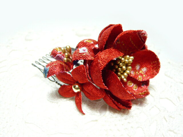 全体の横約10?12cm 厚さ約3cm コーム15本足金メッキ巾約5.5cmちりめん細工ちょっとレトロな大正・昭和風髪飾り♪つまみ簪の手法を手作りしました。