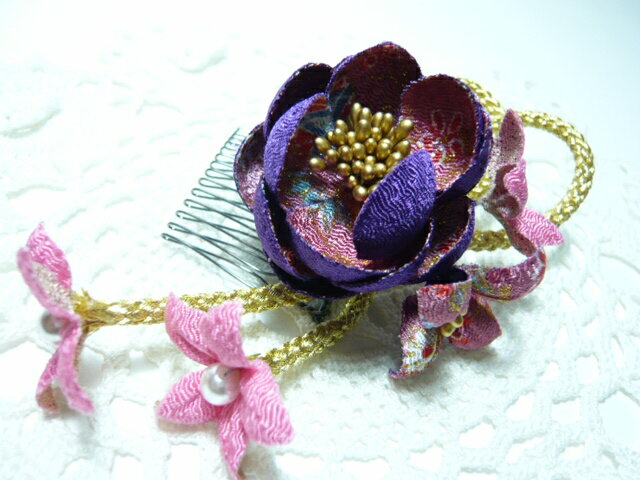 カメリアのお花の直径約5cm全体の横約13cm 縦約7cm 高さ約4cm材質:レーヨンちりめん 金糸成人式や卒業式・結婚式の着物にとっても似合うコームです♪